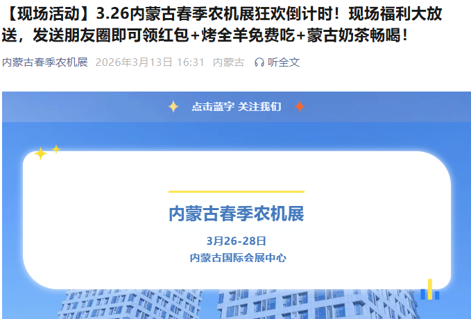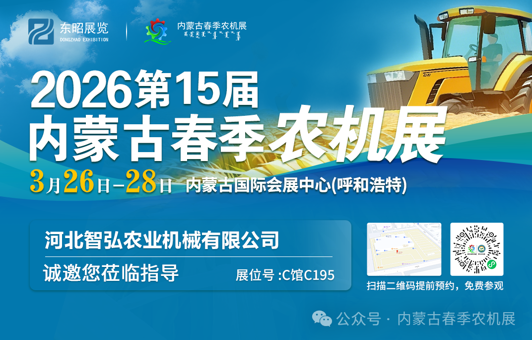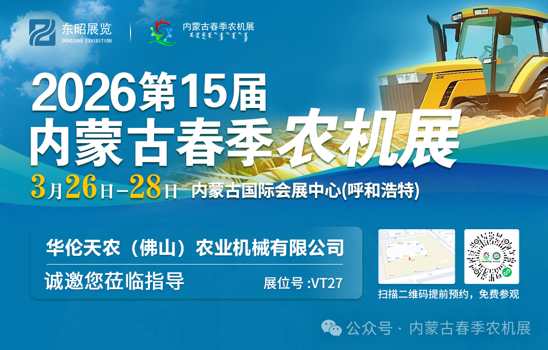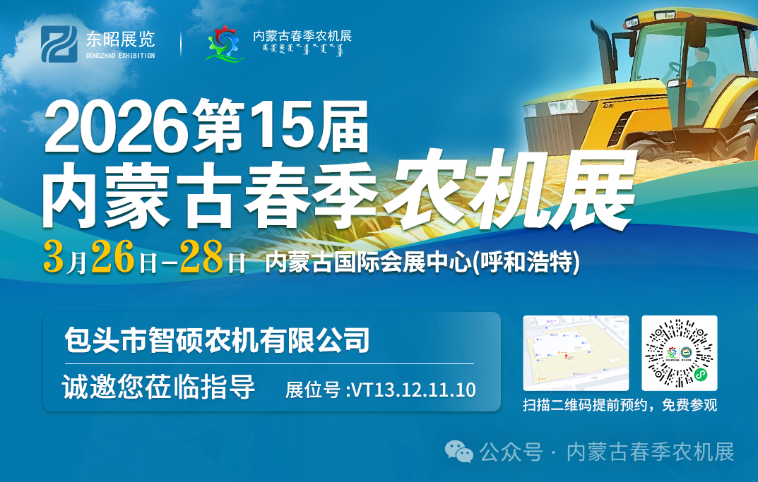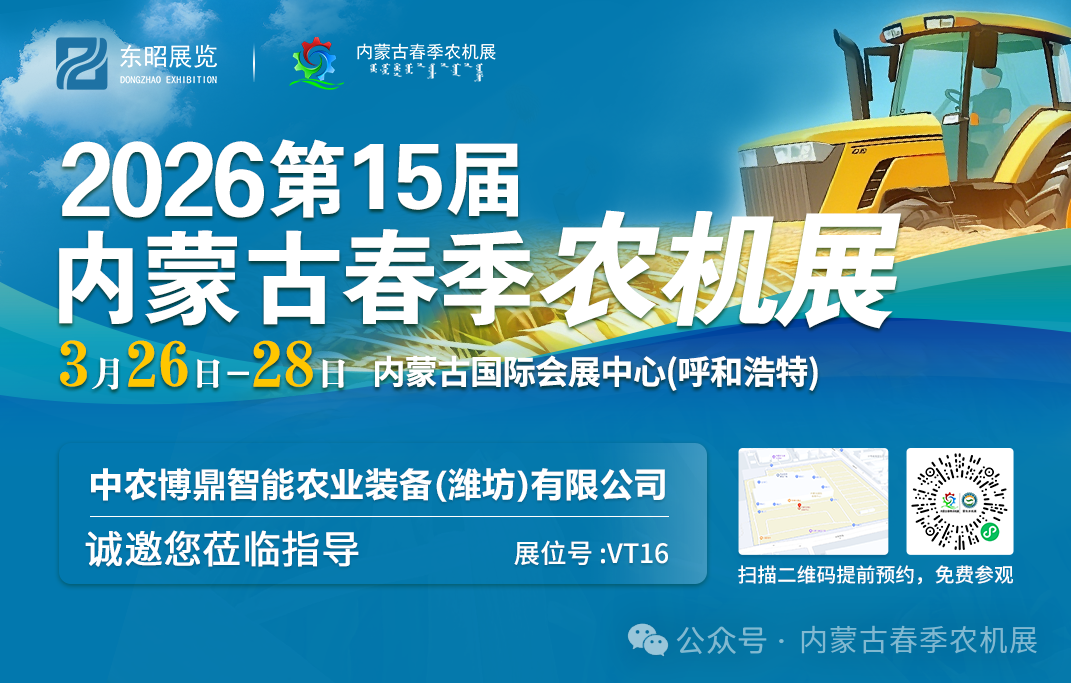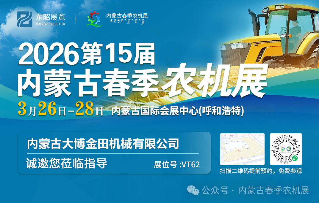 为全面贯彻党的二十大三中全会精神,认真落实习近平总书记对内蒙古重要讲话重要指示批示精神,按照《内蒙古自治区“十四五”农牧业机械化发展规划》要求,加快推进农牧业机械化向全程全面高质高效发展,推动农牧业高质量发展,助力乡村全面振兴。蒙东地区·2026年内蒙古(春季)农业机械博览会将于 3 月 7 日- 9 日在赤峰商贸服务物流园区商务广场(红山区)举办、2026年第十五届内蒙古(春季)农业机械博览会将于 3 月 26 日- 28 日在内蒙古国际会展中心(呼和浩特市)举办。